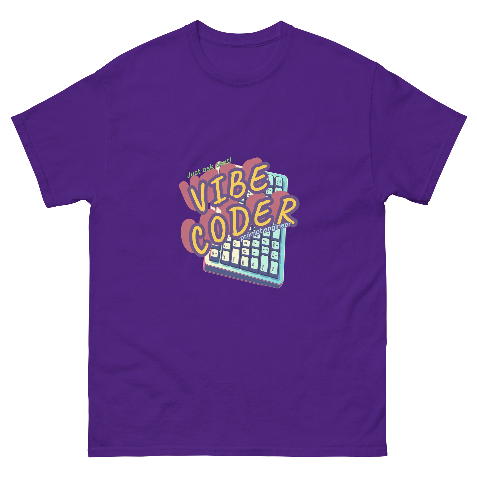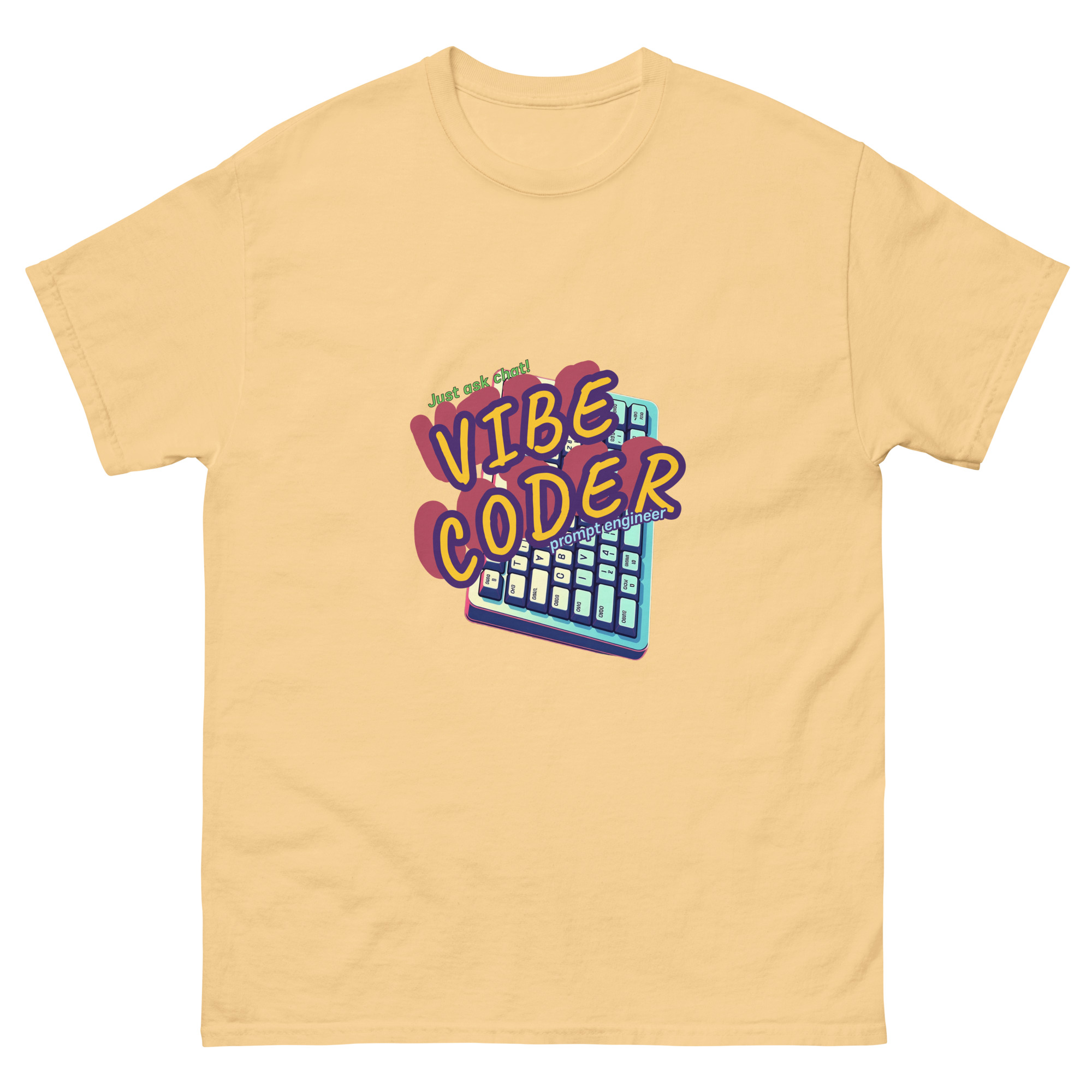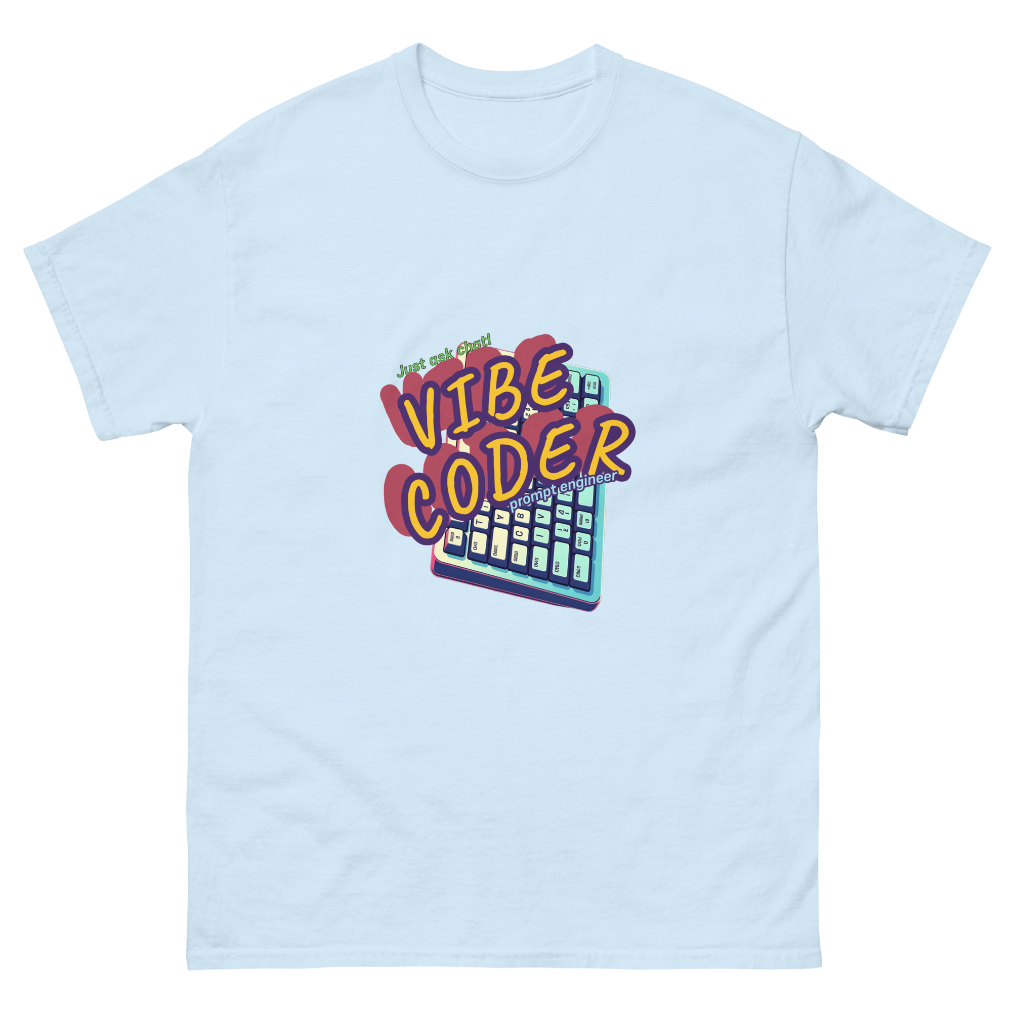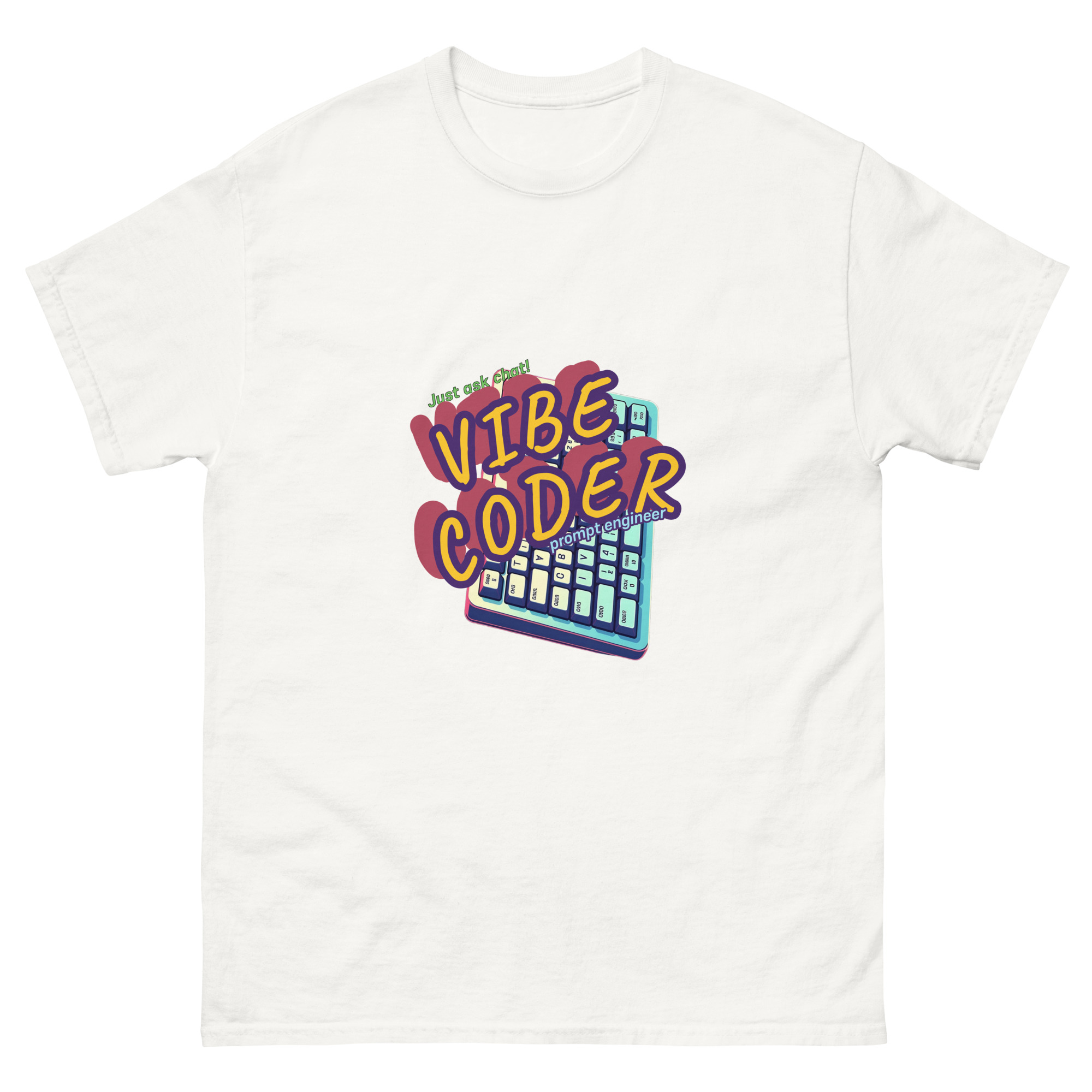 T-shirt with printed VIBE CODER and AI generated image of keyboard. Our own original design.