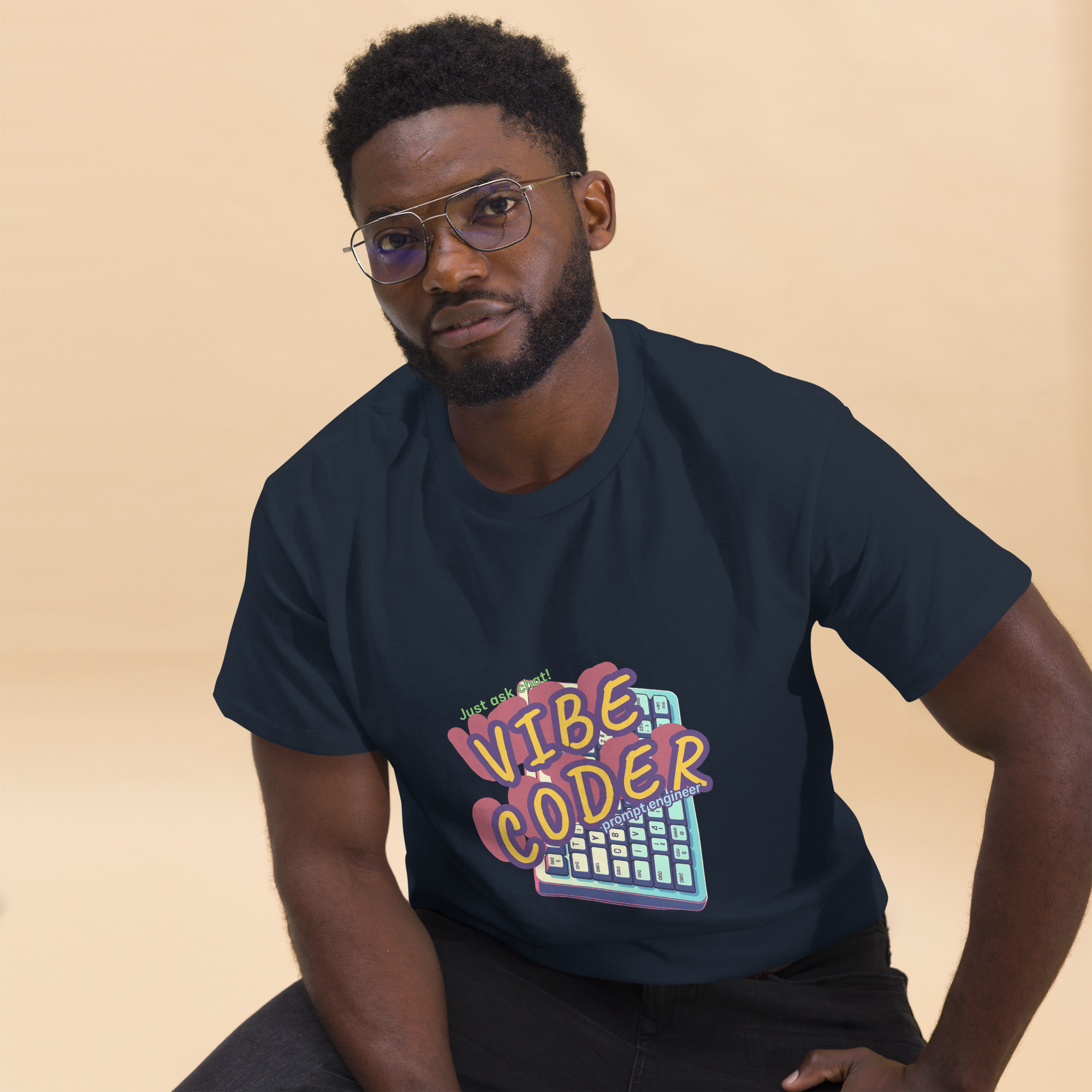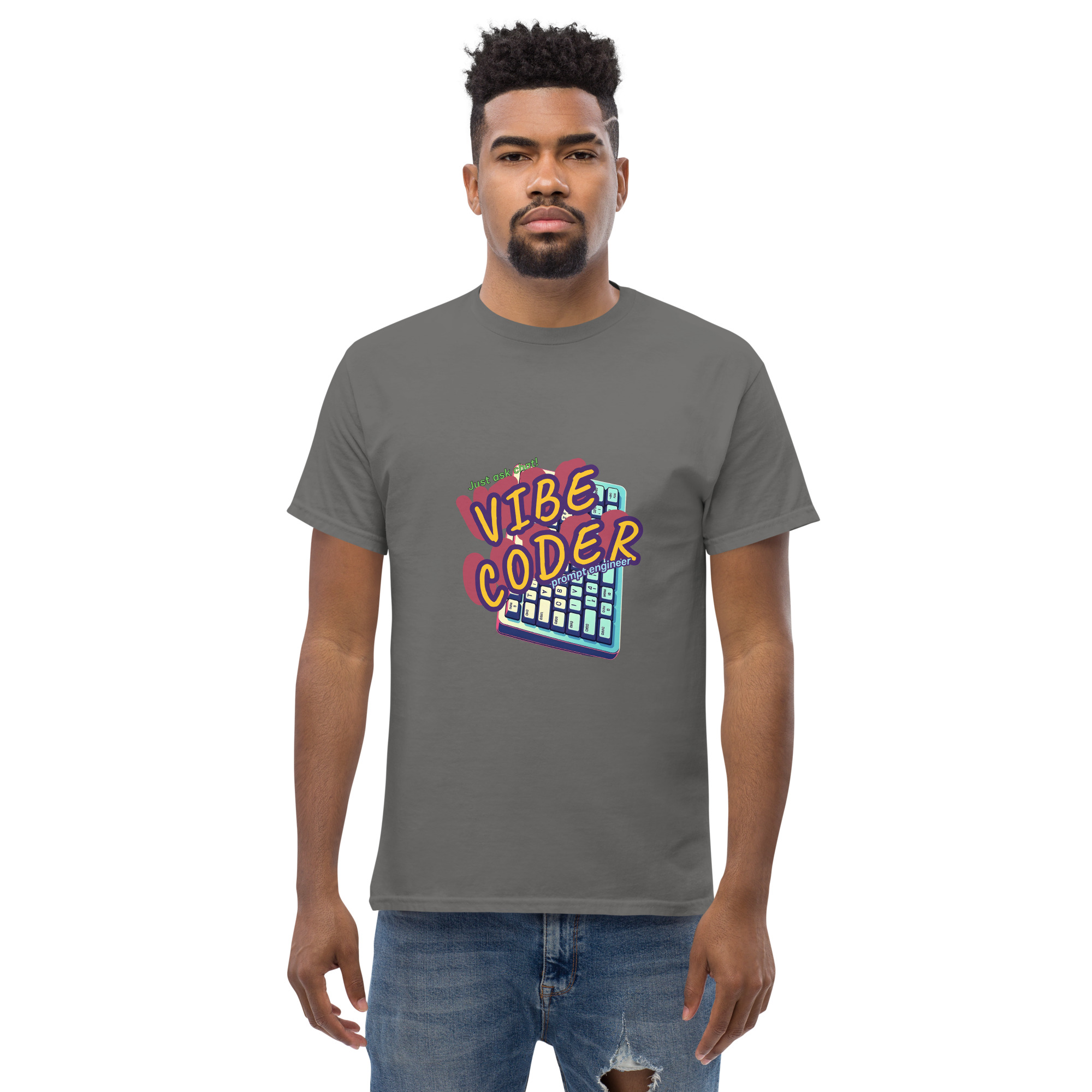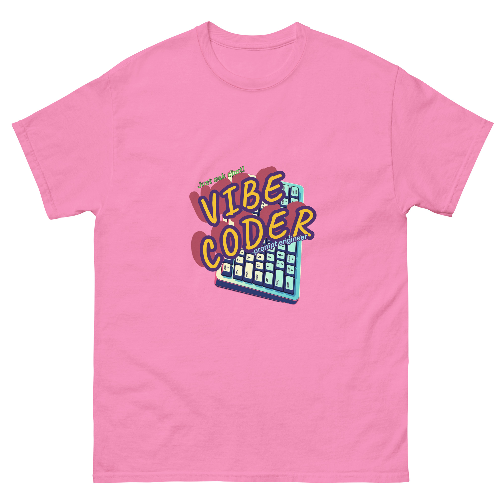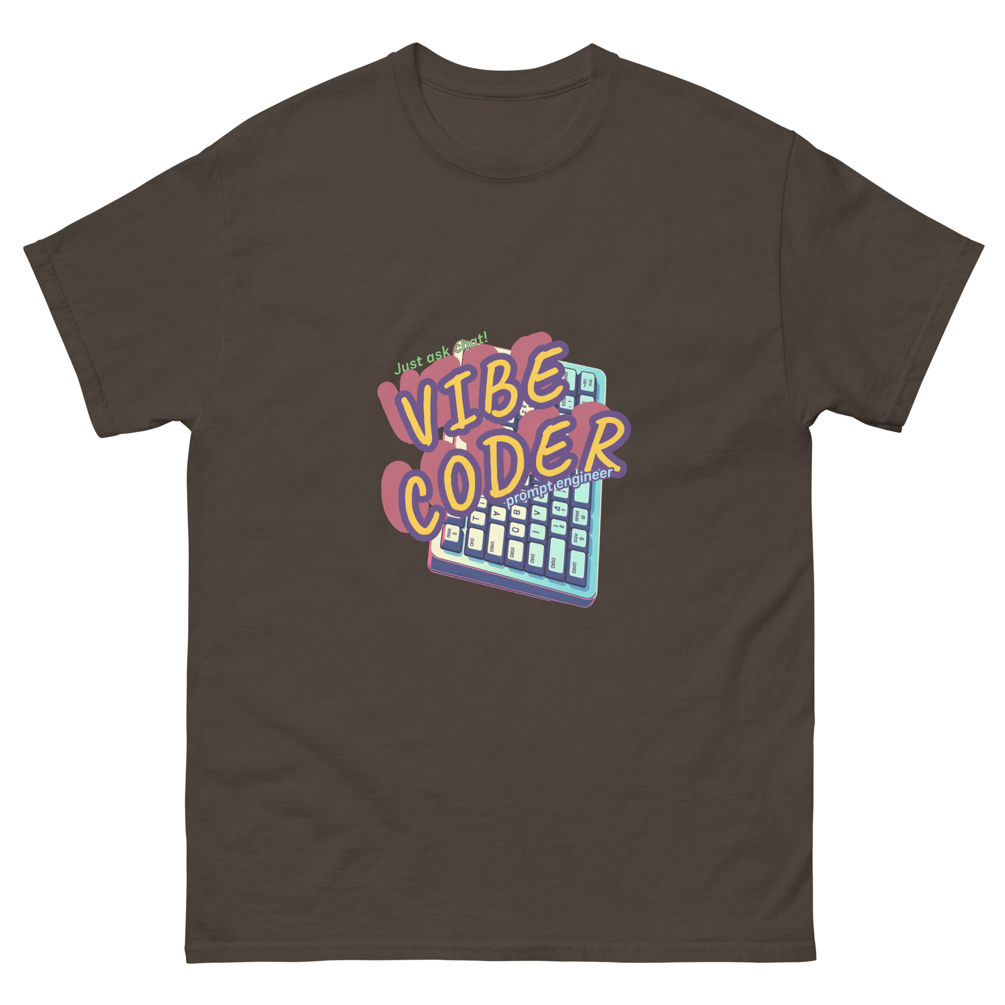 T-shirt with printed VIBE CODER and AI generated image of keyboard. Our own original design.